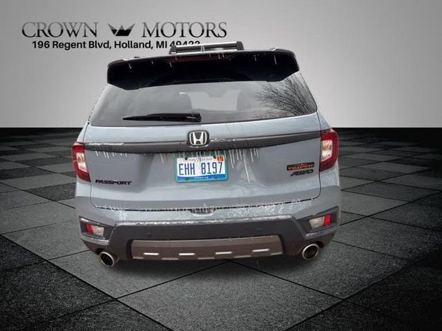 CARFAX One-Owner. Certified. Sonic Gray Pearl 2023 Honda Passport TrailSport AWD 9-Speed Automatic 3.5L V6 24V SOHC i-VTEC **ONE OWNER**, ** LOW MILES**, **HONDA CERTIFIED**, **ACCIDENT FREE**, **LOCAL TRADE IN**, HondaTrue Certified Certified, AWD, 4-Wheel Disc Brakes, 4.334 Axle Ratio, 7 Speakers, A/V remote: CabinControl, ABS brakes, Air Conditioning, Alloy wheels, AM/FM radio: SiriusXM, Apple CarPlay/Android Auto, Auto High-beam Headlights, Auto-dimming Rear-View mirror, Automatic temperature control, Blind Spot Information (BSI) System warning, Brake assist, Bumpers: body-color, Compass, Delay-off headlights, Driver door bin, Driver vanity mirror, Driver's Seat Mounted Armrest, Dual front impact airbags, Dual front side impact airbags, Electronic Stability Control, Emergency communication system: HondaLink Assist, Exterior Parking Camera Rear, Four wheel independent suspension, Front anti-roll bar, Front Bucket Seats, Front Center Armrest, Front dual zone A/C, Front fog lights, Front reading lights, Fully automatic headlights, Garage door transmitter: HomeLink, Heated door mirrors, Heated Front Bucket Seats, Heated front seats, Illuminated entry, Lane departure: Lane Keeping Assist System (LKAS) active, Leather-Trimmed Seats, Low tire pressure warning, Navigation system: Honda Satellite-Linked Navigation System, Occupant sensing airbag, Outside temperature display, Overhead airbag, Overhead console, Panic alarm, Passenger door bin, Passenger seat mounted armrest, Passenger vanity mirror, Power door mirrors, Power driver seat, Power Liftgate, Power moonroof, Power passenger seat, Power steering, Power windows, Radio data system, Radio: 215-Watt Audio System w/7 Speakers, Rear air conditioning, Rear anti-roll bar, Rear reading lights, Rear seat center armrest, Rear window defroster, Rear window wiper, Remote keyless entry, Roof rack: rails only, Security system, Speed control, Speed-sensing steering, Split folding rear seat, Spoiler, Steering wheel mounted audio controls, Tachometer, Telescoping steering wheel, Tilt steering wheel, Traction control, Trip computer, Turn signal indicator mirrors, Variably intermittent wipers, Wheels: 18" Machine-Finish Alloy, AWD.