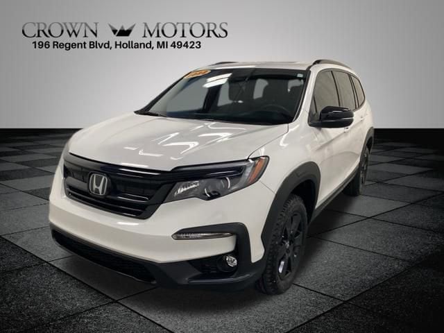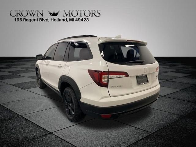CARFAX One-Owner. Clean CARFAX. Platinum White Pearl 2022 Honda Pilot TrailSport AWD 9-Speed Automatic 3.5L V6 24V SOHC i-VTEC **ONE OWNER**, ** LOW MILES**, **ACCIDENT FREE**, AWD, 3rd row seats: split-bench, 4-Wheel Disc Brakes, 4.33 Axle Ratio, 7 Speakers, A/V remote: CabinControl, ABS brakes, Air Conditioning, Alloy wheels, AM/FM radio: SiriusXM, Apple CarPlay/Android Auto, Auto High-beam Headlights, Auto-dimming Rear-View mirror, Automatic temperature control, Blind Spot Information (BSI) System warning, Brake assist, Bumpers: body-color, Delay-off headlights, Driver door bin, Driver vanity mirror, Dual front impact airbags, Dual front side impact airbags, Electronic Stability Control, Emergency communication system: HondaLink Assist, Exterior Parking Camera Rear, Forward collision: Collision Mitigation Braking System (CMBS) + FCW mitigation, Four wheel independent suspension, Front anti-roll bar, Front Bucket Seats, Front Center Armrest, Front dual zone A/C, Front fog lights, Front reading lights, Fully automatic headlights, Garage door transmitter: HomeLink, Heated door mirrors, Heated Front Bucket Seats, Heated front seats, Illuminated entry, Lane departure: Lane Keeping Assist System (LKAS) active, Leather Seat Trim, Low tire pressure warning, Memory seat, Navigation system: Honda Satellite-Linked Navigation System, Occupant sensing airbag, Outside temperature display, Overhead airbag, Overhead console, Panic alarm, Passenger door bin, Passenger vanity mirror, Power door mirrors, Power driver seat, Power Liftgate, Power moonroof, Power passenger seat, Power steering, Power windows, Radio data system, Radio: 215-Watt Audio System, Rear air conditioning, Rear anti-roll bar, Rear reading lights, Rear seat center armrest, Rear window defroster, Rear window wiper, Reclining 3rd row seat, Remote keyless entry, Roof rack: rails only, Security system, Speed control, Speed-sensing steering, Speed-Sensitive Wipers, Split folding rear seat, Spoiler, Steering wheel mounted audio controls, Tachometer, Telescoping steering wheel, Tilt steering wheel, Traction control, Trip computer, Turn signal indicator mirrors, Variably intermittent wipers, Wheels: 18" Exclusive Gloss Black Alloy, AWD.