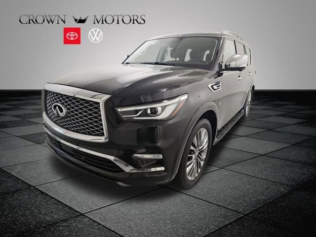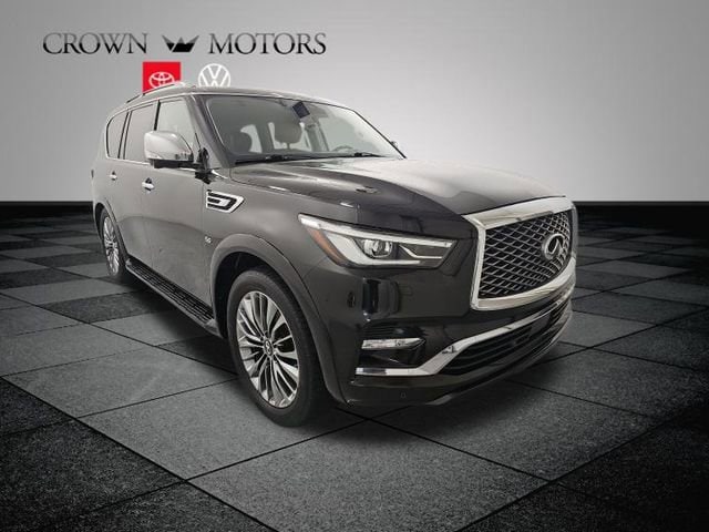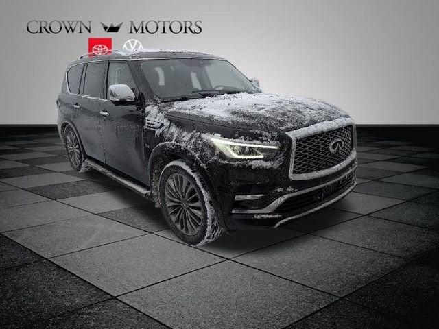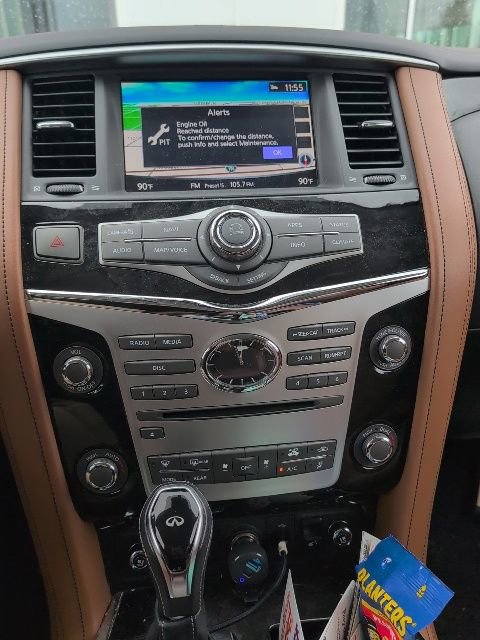 120V Power Outlet, 13 Speakers, 2.94 Axle Ratio, 3rd row seats: split-bench, 4-Wheel Disc Brakes, ABS brakes, Adaptive Front Lighting System, Advanced Climate Control System, Air Conditioning, Alloy wheels, AM/FM radio: SiriusXM, Anti-whiplash front head restraints, Auto High-beam Headlights, Auto tilt-away steering wheel, Auto-dimming door mirrors, Auto-dimming Rear-View mirror, Auto-leveling suspension, Automatic temperature control, Backup Collision Intervention (BCI), Blind Spot Intervention (BSI), Blind Spot Warning, Bose Cabin Surround Sound System, Brake assist, Bumpers: body-color, CD player, Chrome Mirror Caps, Climate-Controlled Front Seats, Delay-off headlights, Deluxe Technology Package, Driver Assistance Package, Driver door bin, Driver vanity mirror, Dual 8" Color Monitors, Dual front impact airbags, Dual front side impact airbags, Electronic Stability Control, Emergency communication system: INFINITI Connection, Espresso/Charcoal Burl Trim, Four wheel independent suspension, Front anti-roll bar, Front Bucket Seats, Front Center Armrest, Front dual zone A/C, Front fog lights, Front Pre-Crash Seatbelts, Front reading lights, Fully automatic headlights, Garage door transmitter: HomeLink, Genuine wood console insert, Genuine wood dashboard insert, Genuine wood door panel insert, Headlight Washers, Heated 2nd-Row Seats, Heated door mirrors, Heated Front Bucket Seats, Heated front seats, Heated steering wheel, Hydraulic Body Motion Control System, Illuminated entry, Intelligent Cruise Control (Full-Speed Range), Lane Departure Warning System, Leather Shift Knob, Leather steering wheel, Leather-Appointed Seats w/Stratford Burl Trim, Low tire pressure warning, Memory seat, Navigation System, Occupant sensing airbag, Outside temperature display, Overhead airbag, Overhead console, Panic alarm, Passenger door bin, Passenger vanity mirror, Power door mirrors, Power driver seat, Power Liftgate, Power moonroof, Power passenger seat, Power steering, Power windows, Radio data system, Radio: AM/FM/HD Single In-Dash CD/DVD Player w/MP3, Rain sensing wipers, Rear air conditioning, Rear anti-roll bar, Rear audio controls, Rear reading lights, Rear seat center armrest, Rear window defroster, Rear window wiper, Reclining 3rd row seat, Remote keyless entry, Roof rack: rails only, Security system, Semi-Aniline Leather-Appointed Seating w/Quilting, Smart Rear View Mirror (SRVM), Speed control, Speed-sensing steering, Split Bench Seat Package, Split folding rear seat, Spoiler, Steering wheel memory, Steering wheel mounted audio controls, Tachometer, Telescoping steering wheel, Theater Package, Tilt steering wheel, Tire & Wheel Package, Traction control, Trip computer, Turn signal indicator mirrors, Variably intermittent wipers, Voltmeter, Wheels: 20" x 8.0" Split 6-Spoke Aluminum-Alloy, Wheels: 22" x 8.0" 14-Spoke Forged Aluminum-Alloy, Wireless Headphones (2).