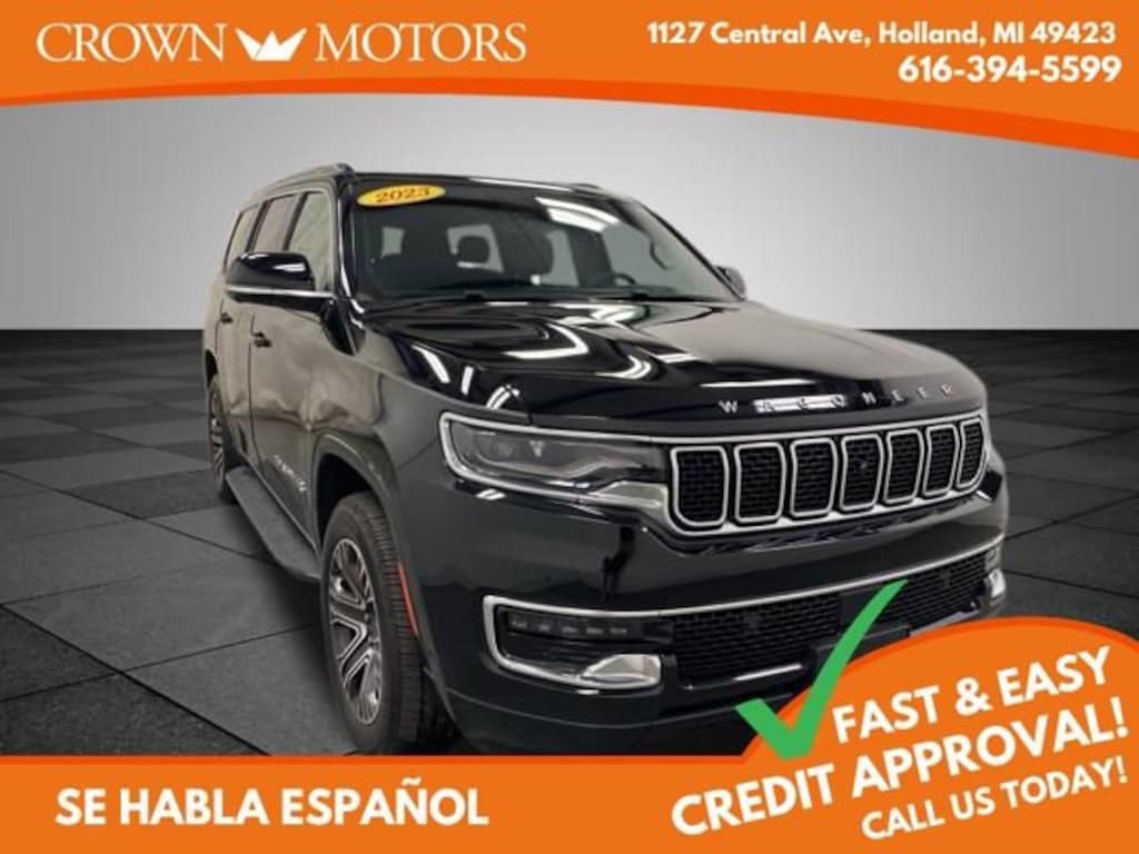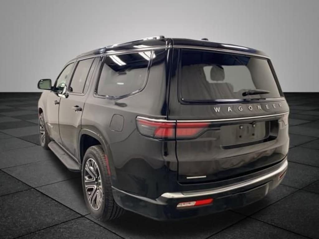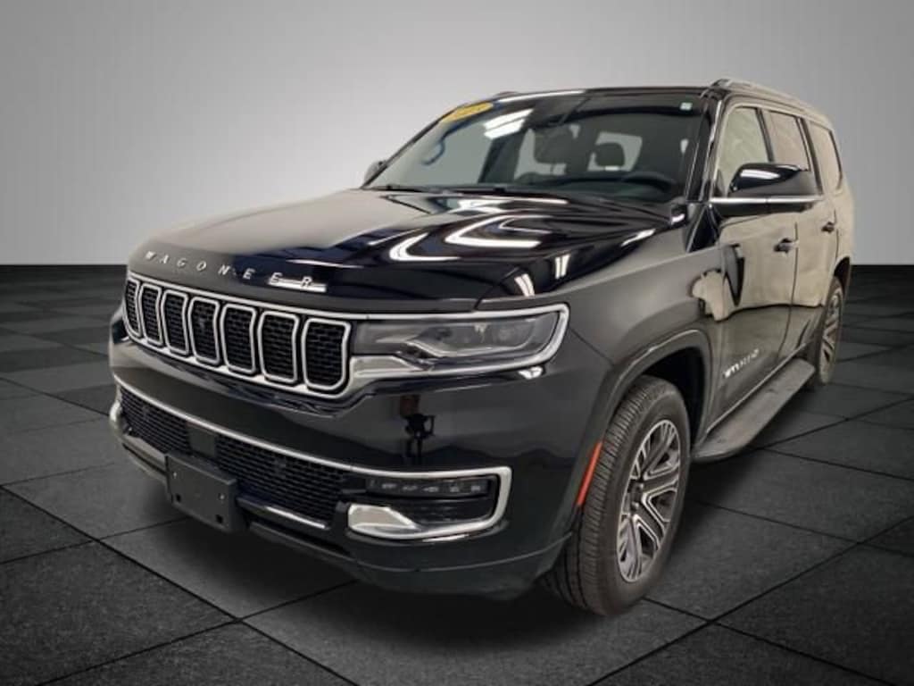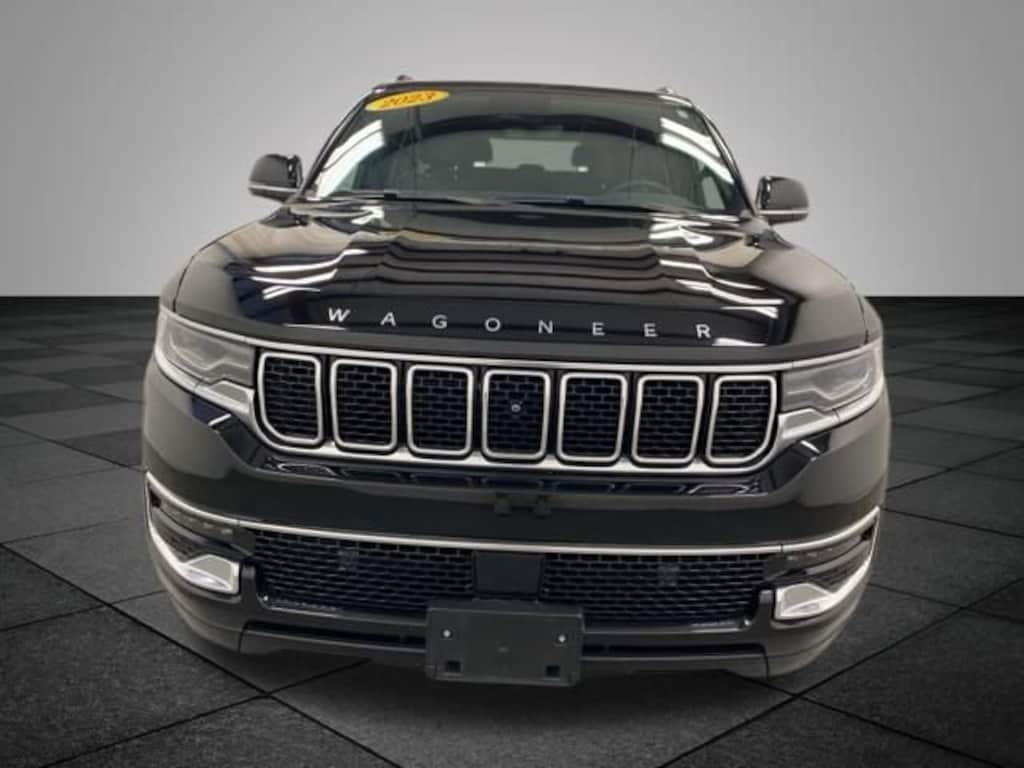 CARFAX One-Owner. Diamond Black Crystal Pearlcoat 2023 Jeep Wagoneer 4WD 8-Speed Automatic 5.7L V8 2nd Row Manual Window Shades, 3 Panel Sunroof, Active Lane Management System, Adaptive Cruise Control w/Stop & Go, Adjustable Roof Rail Crossbars, Auto High Beam Headlamp Control, Cargo Cover, Convenience Group I, Heated Second Row Seats, Navigation System, P&P Park & Unpark Assist w/Stop System, Premium Group I, Quick Order Package 22E (DISC), Rain Sensitive Windshield Wipers, Reversible Carpet/Vinyl Cargo Mat, Side Distance Warning, Surround View Camera System, Wheels: 20" x 9.0" Premium 2 Aluminum, Wireless Charging Pad, 10 Speakers, 3.21 Rear Axle Ratio, 3rd row seats: bench, 4-Wheel Disc Brakes, ABS brakes, Adjustable pedals, Air Conditioning, Alloy wheels, AM/FM radio: SiriusXM with 360L, Anti-whiplash front head restraints, Audio memory, Auto-dimming door mirrors, Auto-dimming Rear-View mirror, Auto-leveling suspension, Automatic temperature control, Brake assist, Bumpers: body-color, Compass, Delay-off headlights, Driver door bin, Driver vanity mirror, Driver's Seat Mounted Armrest, Dual front impact airbags, Dual front side impact airbags, Electronic Stability Control, Emergency communication system: Automatic SOS Call, Exterior Parking Camera Rear, Four wheel independent suspension, Front anti-roll bar, Front Bucket Seats, Front Center Armrest w/Storage, Front dual zone A/C, Front fog lights, Front reading lights, Fully automatic headlights, Garage door transmitter, Heated door mirrors, Heated front seats, Heated steering wheel, Illuminated entry, Knee airbag, Leather Trimmed Bucket Seats, Low tire pressure warning, Memory seat, Normal Duty Suspension, Occupant sensing airbag, Outside temperature display, Overhead airbag, Overhead console, Panic alarm, Passenger door bin, Passenger seat mounted armrest, Passenger vanity mirror, Pedal memory, Power adjustable front head restraints, Power door mirrors, Power driver seat, Power Liftgate, Power passenger seat, Power steering, Power windows, Radio data system, Radio: Uconnect 5 Nav w/10.1" Display, Rear air conditioning, Rear anti-roll bar, Rear dual zone A/C, Rear reading lights, Rear seat center armrest, Rear window defroster, Rear window wiper, Reclining 3rd row seat, Remote keyless entry, Security system, Speed control, Speed-sensing steering, Speed-Sensitive Wipers, Split folding rear seat, Steering wheel memory, Steering wheel mounted audio controls, Tachometer, Telescoping steering wheel, Tilt steering wheel, Traction control, Trip computer, Turn signal indicator mirrors, Variably intermittent wipers, Ventilated front seats, Voltmeter, Wheels: 18" x 8.0" Aluminum Base Finish, 2nd Row Manual Window Shades, 3 Panel Sunroof, Active Lane Management System, Adaptive Cruise Control w/Stop & Go, Adjustable Roof Rail Crossbars, Auto High Beam Headlamp Control, Cargo Cover, Convenience Group I, Heated Second Row Seats, Navigation System, P&P Park & Unpark Assist w/Stop System, Premium Group I, Quick Order Package 22E (DISC), Rain Sensitive Windshield Wipers, Reversible Carpet/Vinyl Cargo Mat, Side Distance Warning, Surround View Camera System, Wheels: 20" x 9.0" Premium 2 Aluminum, Wireless Charging Pad.