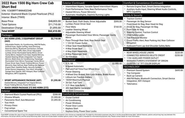 Step inside and you'll be greeted by a spacious and well-appointed interior. The Big Horn Level 2 Equipment Group brings a wealth of premium features, including an 8.4" Uconnect touchscreen display, Apple CarPlay, Android Auto, and a premium audio system with 9 amplified speakers and a subwoofer. Heated front seats and a heated steering wheel ensure your comfort, while the power-folding mirrors and remote start system add convenience.