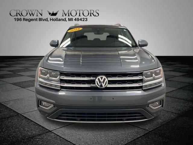 Clean CARFAX. Platinum Gray Metallic 2018 Volkswagen Atlas SEL 4Motion AWD 8-Speed Automatic with Tiptronic 3.6L V6 **ACCIDENT FREE**, **LOCAL TRADE IN**, AWD, 3.60 Axle Ratio, 3rd row seats: split-bench, 4-Wheel Disc Brakes, 8 Speakers, ABS brakes, Air Conditioning, Alloy wheels, AM/FM radio: SiriusXM, Auto-dimming Rear-View mirror, Automatic temperature control, Brake assist, Bumpers: body-color, Compass, Delay-off headlights, Driver door bin, Driver vanity mirror, Dual front impact airbags, Dual front side impact airbags, Electronic Stability Control, Emergency communication system: VW Car-Net, Exterior Parking Camera Rear, Four wheel independent suspension, Front anti-roll bar, Front Bucket Seats, Front Center Armrest, Front dual zone A/C, Front fog lights, Front reading lights, Garage door transmitter: HomeLink, Heated door mirrors, Heated Front Bucket Seats, Heated front seats, Heavy Duty Trunk Liner w/VW CarGo Blocks, Illuminated entry, Low tire pressure warning, Memory seat, Occupant sensing airbag, Outside temperature display, Overhead airbag, Overhead console, Panic alarm, Passenger door bin, Passenger vanity mirror, Power door mirrors, Power driver seat, Power Liftgate, Power moonroof, Power passenger seat, Power steering, Power windows, Radio data system, Radio: Composition Media 8.0" Touchscreen w/CD, Rain sensing wipers, Rear air conditioning, Rear anti-roll bar, Rear reading lights, Rear seat center armrest, Rear window defroster, Rear window wiper, Remote CD player, Remote keyless entry, Roadside Assistance Kit, Roof rack: rails only, Rubber Mats Kit - Bench Seats, Security system, Speed control, Speed-sensing steering, Split folding rear seat, Spoiler, Standard Suspension, Steering wheel mounted audio controls, Tachometer, Telescoping steering wheel, Tilt steering wheel, Traction control, Trip computer, Turn signal indicator mirrors, V-Tex Leatherette Seating Surfaces, Variably intermittent wipers, Wheels: 18" Prisma Alloy, AWD.